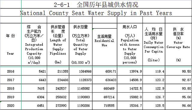縣城供水,截止2020年,綜合生產能力達6451萬立方米/日,2018年,供水綜合生產能力提升至7415萬立方米/日,2019年、2020年出現回落。供水管網長度達27.3萬公里,較“十二五”新增21.3%。供水總量達119億立方米,增長約11.3%。