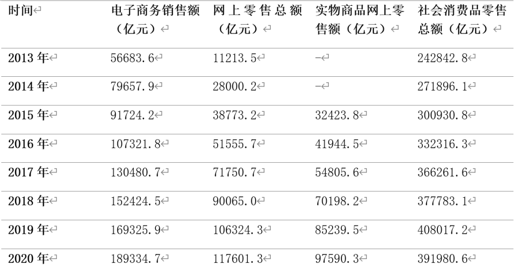 近年來我國互聯網產業呈現高速發展態勢,網民數量與互聯網普及率不斷增長,為網絡購物奠定了龐大的用戶基礎。數據顯示,截至2020年3月,我國網民規模達9.04億人,互聯網普及率為64.5%,較2018年底提升4.9個百分點。與此同時,電子商務市場規模也在不斷增長。2020年,電商領域總就業人數達到6015萬,較2019年增長約17.35%,預計到2025年將達到7000萬人。此外,2021年上半年,我國電商用戶達8.12 億,較2020年12月增長2965萬。2020年網上零售額為11.76萬億元,是2013年的10.5倍,占社會消費品零售額的比重由2013年的5%增長到2020年的30%。《2021年中國電商年度發展報告》顯示,今年前三季度我國網上零售額達9.19萬億元,同比增長18.5%。